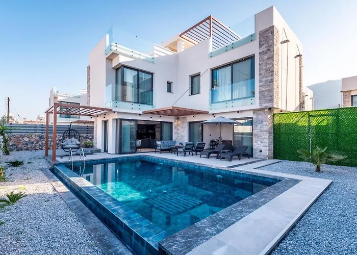 A Peace Park csaknem egy 10 perces autóútra, a Szent Hilárión vár pedig 3 km-es távolságra található az 5 fürdőszobás villától. A 10 szobás villa egy 4 km-es távolságra fekszik az olyan természeti látványosságoktól, mint a Kerínia-hegység.
